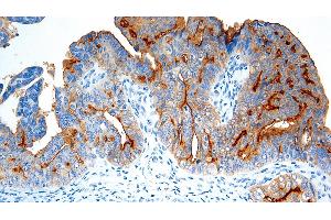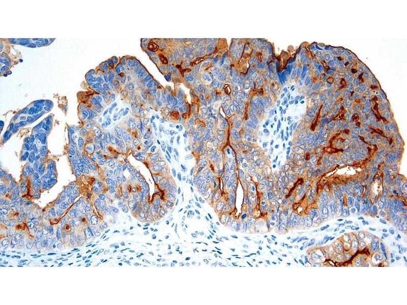Immunohistochemistry on paraffin sections. Suggested dilution: 1:100 for 30 minutes at 25°C. Heat induced epitope retrieval using Epitope Retrieval Solution pH 6.0. This is provided as a guide and users should determine their own optimal working dilutions.,Immunohistochemical (IHC) staining techniques allow for the visualization of antigens via the sequential application of a specific antibody to the antigen (primary antibody), a secondary antibody to the primary antibody and an enzyme complex with a chromogenic substrate with interposed washing steps. The enzymatic activation of the chromogen results in a visible reaction product at the antigen site. The specimen may then be counterstained and coverslipped. Results are interpreted using a light microscope.