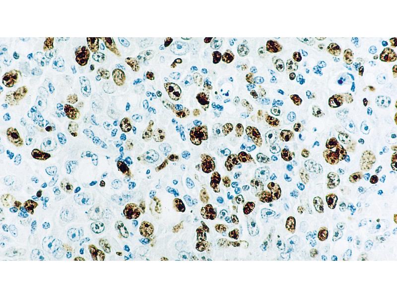 Immunohistochemistry on paraffin sections. Heat Induced Epitope Retrieval (HIER): Epitope Retrieval Solution pH 6. Suggested dilution: 1:200 for 30 minutes at 25 °C. This is provided as a guide and users should determine their own optimal working dilutions. Immunohistochemical (IHC) staining techniques allow for the visualization of antigens via the sequential application of a specific antibody to the antigen (primary antibody), a secondary antibody to the primary antibody and an enzyme complex with a chromogenic substrate with interposed washing steps. The enzymatic activation of the chromogen results in a visible reaction product at the antigen site. The specimen may then be counterstained and coverslipped. Results are interpreted using a light microscope.