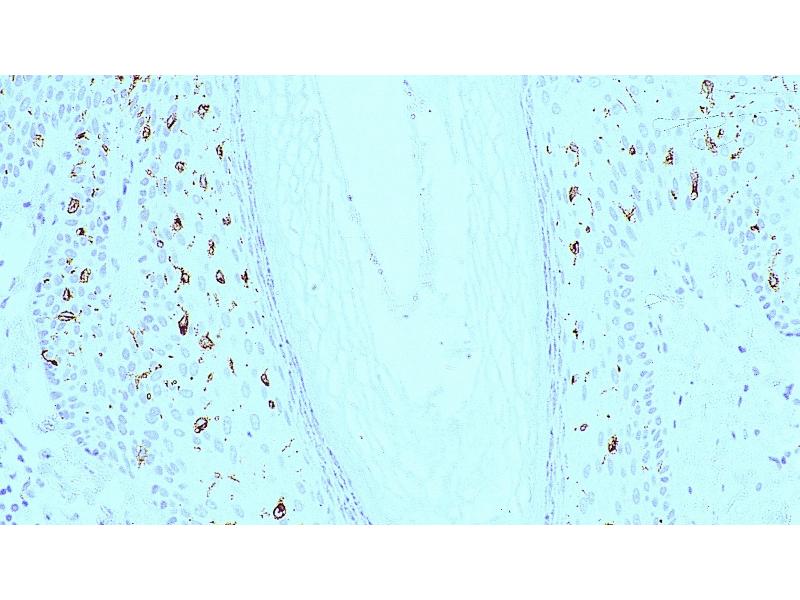 Immunohistochemistry on paraffin sections. Heat Induced Epitope Retrieval (HIER): Epitope Retrieval Solution pH 6. Suggested dilution: 1:50 for 30 minutes at 25 °C. This is provided as a guide and users should determine their own optimal working dilutions. Immunohistochemical (IHC) staining techniques allow for the visualization of antigens via the sequential application of a specific antibody to the antigen (primary antibody), a secondary antibody to the primary antibody and an enzyme complex with a chromogenic substrate with interposed washing steps. The enzymatic activation of the chromogen results in a visible reaction product at the antigen site. The specimen may then be counterstained and coverslipped. Results are interpreted using a light microscope.
