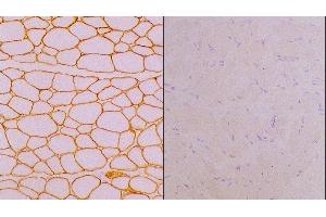 - Reacts strongly with laminin alpha 2 chain of merosin in human and rabbit skeletal muscle. No reaction is observed in muscle sections from mouse, rat, dog, chicken, hamster or pig.