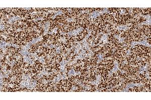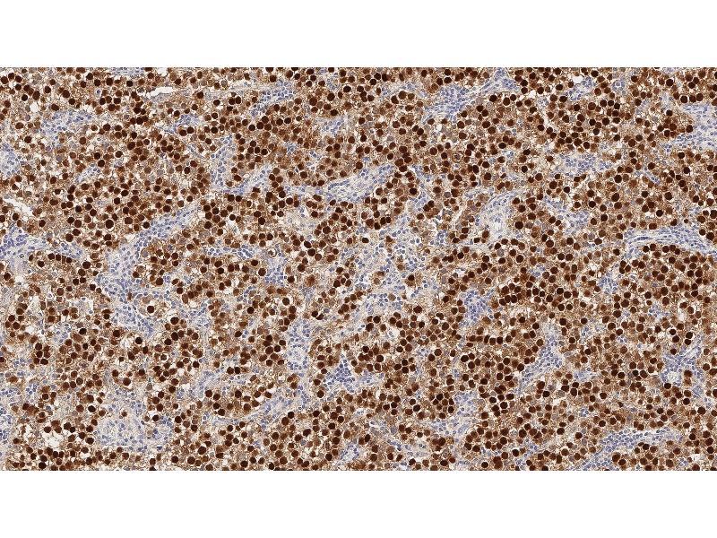 Immunohistochemistry on paraffin sections. Heat Induced Epitope Retrieval (HIER): Epitope Retrieval Solution pH 6. Suggested dilution: 1:100 for 30 minutes at 25 °C. This is provided as a guide and users should determine their own optimal working dilutions. Immunohistochemical (IHC) staining techniques allow for the visualization of antigens via the sequential application of a specific antibody to the antigen (primary antibody), a secondary antibody to the primary antibody and an enzyme complex with a chromogenic substrate with interposed washing steps. The enzymatic activation of the chromogen results in a visible reaction product at the antigen site. The specimen may then be counterstained and coverslipped. Results are interpreted using a light microscope.