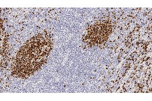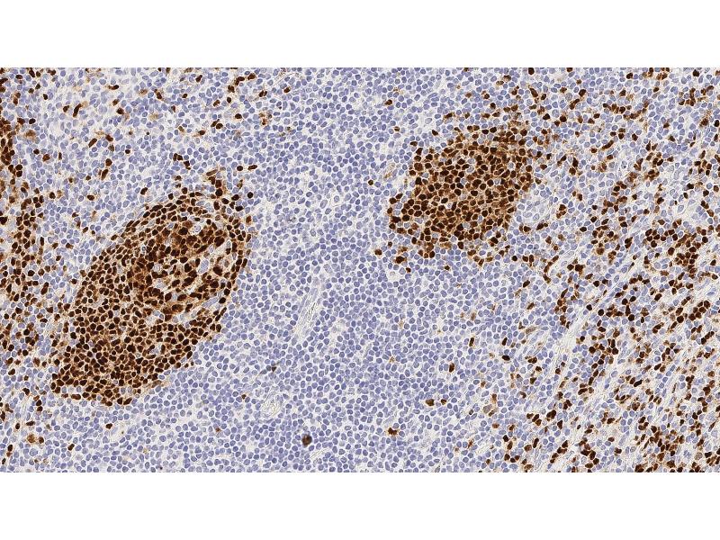 Heat Induced Epitope Retrieval (HIER): Epitope Retrieval Solution pH 6. Suggested dilution: 1:100 for 30 minutes at 25 °C. This is provided as a guide and users should determine their own optimal working dilutions. Technical note: When utilised in immunohistochemistry, the use of H2O2 to block endogenous peroxidase has been shown to have a detrimental effect on the epitope recognized. It is, therefore, CRITICAL that blocking with H2O2 should be carried out after application of the primary antibody with solutions of no greater than 3 % . If these recommendations are not followed, staining intensity will be reduced.,Immunohistochemical (IHC) staining techniques allow for the visualization of antigens via the sequential application of a specific antibody to the antigen (primary antibody), a secondary antibody to the primary antibody and an enzyme complex with a chromogenic substrate with interposed washing steps. The enzymatic activation of the chromogen results in a visible reaction product at the antigen site. The specimen may then be counterstained and coverslipped. Results are interpreted using a light microscope.