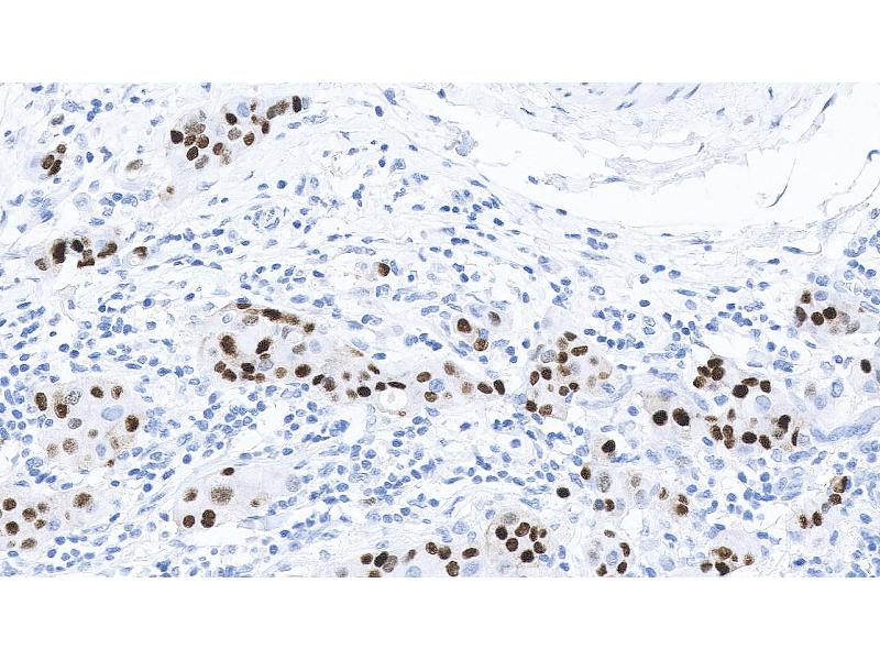 Immunohistochemistry on paraffin sections. Heat Induced Epitope Retrieval (HIER): Epitope Retrieval Solution pH 6. Suggested dilution: 1:100 for 30 minutes at 25 °C. This is provided as a guide and users should determine their own optimal working dilutions. Immunohistochemical (IHC) staining techniques allow for the visualization of antigens via the sequential application of a specific antibody to the antigen (primary antibody), a secondary antibody to the primary antibody and an enzyme complex with a chromogenic substrate with interposed washing steps. The enzymatic activation of the chromogen results in a visible reaction product at the antigen site. The specimen may then be counterstained and coverslipped. Results are interpreted using a light microscope.