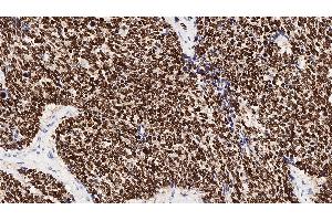 Immunohistochemistry on paraffin sections. Heat Induced Epitope Retrieval (HIER): Epitope Retrieval Solution pH 6. Suggested dilution: 1:200 for 30 minutes at 25 °C. This is provided as a guide and users should determine their own optimal working dilutions. Immunohistochemical (IHC) staining techniques allow for the visualization of antigens via the sequential application of a specific antibody to the antigen (primary antibody), a secondary antibody to the primary antibody and an enzyme complex with a chromogenic substrate with interposed washing steps. The enzymatic activation of the chromogen results in a visible reaction product at the antigen site. The specimen may then be counterstained and coverslipped. Results are interpreted using a light microscope.
