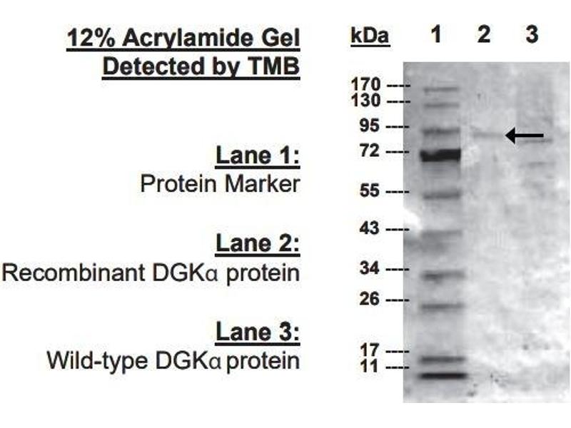 This antibody recognizes the alpha isoform of diacylglycerol kinase (DGK). DGK catalyzes a reaction terminating the protein kinase C mediated signaling by converting diacylglycerol (DAG) to phosphatidic acid (PA), a signaling lipid which is involved in DNA synthesis, phospholipid synthesis, and regulation of several enzymes.
