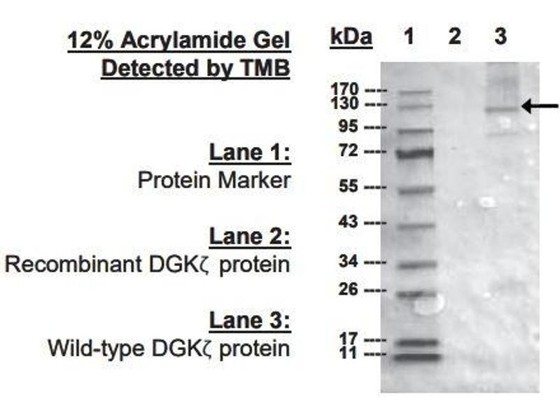 DGK catalyzes a reaction terminating the protein kinase C (PKC)mediated signaling by converting diacylglycerol (DAG) to phosphatidic acid (PA), a signaling lipid which is involved in DNA synthesis, phospholipid synthesis, and regulation of several enzymes. DAG is an intermediate in phospholipid synthesis which functions as an allosteric activator of PKC. Research shows the zeta isoform of DGK undergoes tissue-specific alternative splicing resulting in an elongated N terminus enzyme predominantly in muscle.