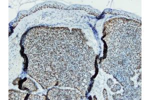P63/TP63 is a member of the p53 family of transcription factors expressed in the cell nuclei of a variety of tissues - heart, kidney, placenta, prostate, testis, tonsil, thymus and skeletal muscle. In cancer, p63 is expressed predominantly in basal cell and squamous cell carcinomas.