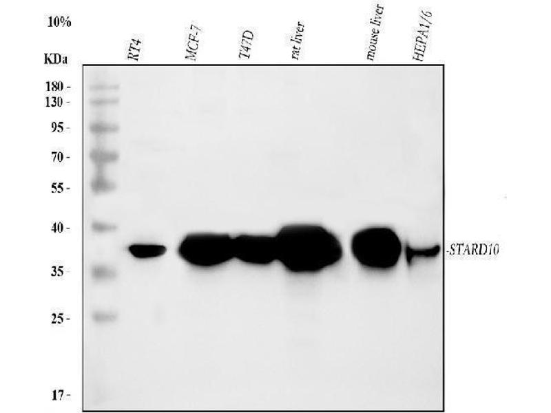 Background: StAR-related lipid transfer protein 10 (STARD10) or PCTP-like protein is a lipid transfer protein that in humans is encoded by the STARD10 gene. StarD10 is a dual-specificity lipid transfer protein capable of shuttling phosphatidylcholine (PC) and phosphatidylethanolamine (PE) between membranes in vitro, changes in membrane composition of PC and PE occur before the morphological tumorigenic events. Interestingly, STARD10 has been described to be highly expressed in 35-40 % of ERBB2-positive breast cancers. StarD10 was initially discovered based on its cross-reactivity with a phosphoserine-specific antibody in mammary tumors from Neu/ErbB2 transgenic mice and subsequently isolated from SKBR3 human breast carcinoma cells using a multistep biochemical purification strategy. StarD10 contains a steroidogenic acute regulatory protein (StAR/StarD1)-related lipid transfer (START) domain that is thought to mediate binding of lipids. STARD10 is highly expressed in the liver and has been shown to transfer phosphatidylcholine.