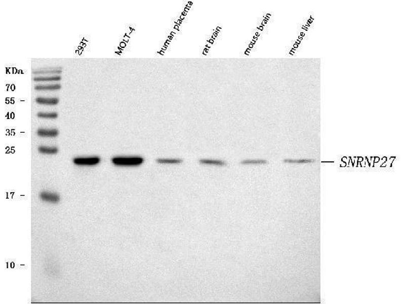 - Anti-SNRNP27 Antibody (ABIN7599614). Tested in ELISA, IF, IHC, ICC, WB applications. This antibody reacts with Human, Mouse, Rat. This is a premium antibody that guarantees superior quality, high affinity, and strong signals with minimal background in Western blot applications.