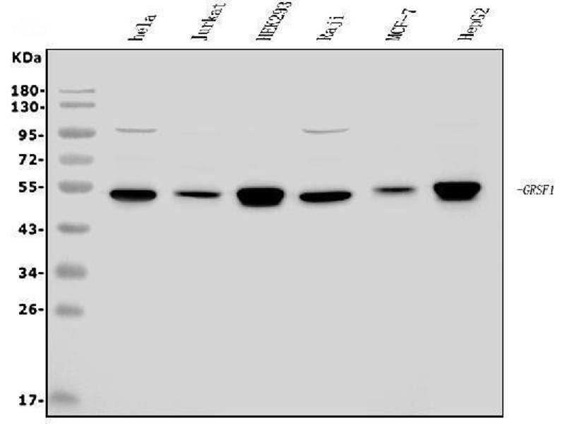 - Anti-GRSF1 Antibody (ABIN7599803). Tested in ELISA, Flow Cytometry, IF, IHC, ICC, WB applications. This antibody reacts with Human. This is a premium antibody that guarantees superior quality, high affinity, and strong signals with minimal background in Western blot applications.