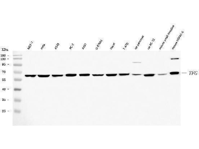 Background: Protein TFG is a protein that in humans is encoded by the TFG gene. There are several documented fusion oncoproteins encoded partially by this gene. This gene also participates in several oncogenic rearrangements resulting in anaplastic lymphoma and mixoid chondrosarcoma, and may play a role in the NF-kappaB pathway. Multiple transcript variants have been found for this gene.