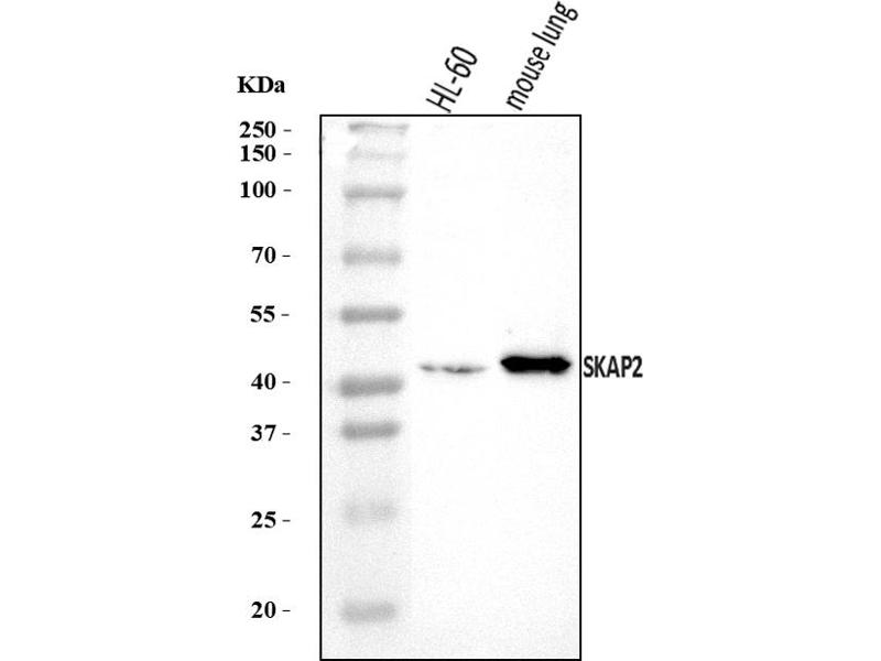 Background: Src kinase-associated phosphoprotein 2 is an enzyme that in humans is encoded by the SKAP2 gene. The protein encoded by this gene shares homology with Src kinase-associated phosphoprotein 1, and is a substrate of Src family kinases. It is an adaptor protein that is thought to play an essential role in the Src signaling pathway, and in regulating proper activation of the immune system. This protein contains an amino terminal coiled-coil domain for self-dimerization, a plecskstrin homology (PH) domain required for interactions with lipids at the membrane, and a Src homology (SH3) domain at the carboxy terminus. Some reports indicate that this protein inhibits actin polymerization through interactions with actin assembly factors, and might negatively regulate the invasiveness of tumors by modulating actin assembly. Alternative splicing results in multiple transcript variants encoding different isoforms.
