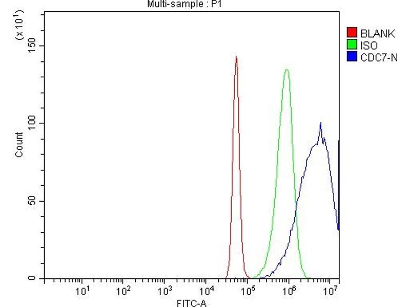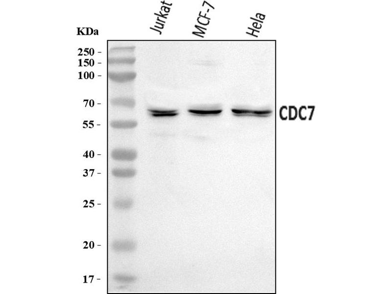 - Anti-CDC7 Antibody (ABIN7600131). Tested in ELISA, Flow Cytometry, WB applications. This antibody reacts with Human. This is a premium antibody that guarantees superior quality, high affinity, and strong signals with minimal background in Western blot applications.