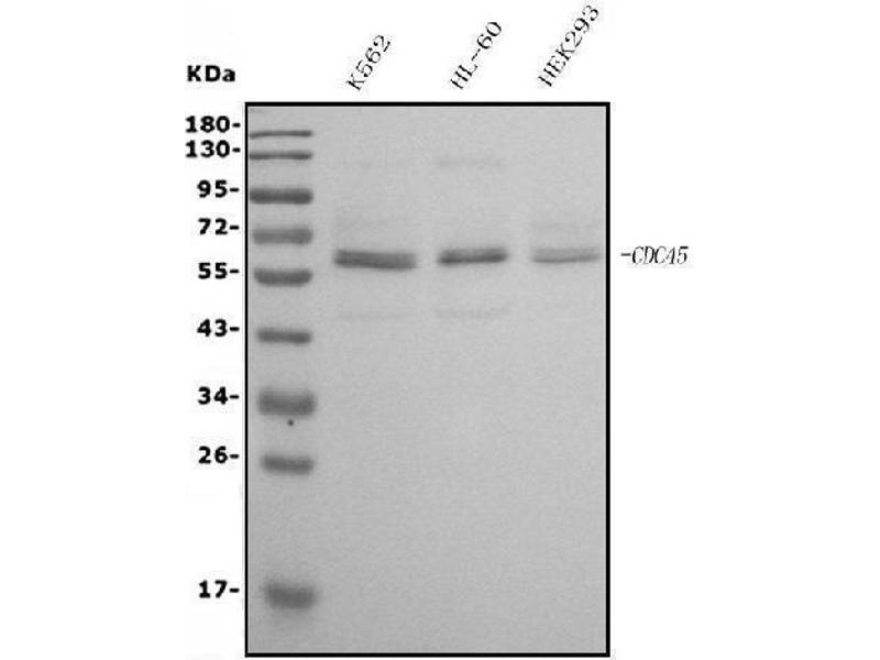 Background: CDC45 is a protein that in humans is encoded by the CDC45L gene. The protein encoded by this gene was identified by its strong similarity with Saccharomyces cerevisiae Cdc45, an essential protein required to the initiation of DNA replication. Cdc45 is a member of the highly conserved multiprotein complex including Cdc6/Cdc18, the minichromosome maintenance proteins (MCMs) and DNA polymerase, which is important for early steps of DNA replication in eukaryotes. This protein has been shown to interact with MCM7 and DNA polymerase alpha. Studies of the similar gene in Xenopus suggested that this protein play a pivotal role in the loading of DNA polymerase alpha onto chromatin. Alternate splicing results in multiple transcript variants.