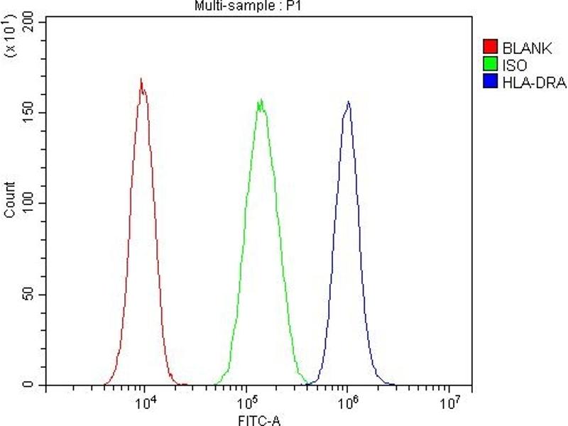 Background: HLA class II histocompatibility antigen, DR alpha chain?is a?protein?that in humans is encoded by the HLA-DRA?gene. It is mapped to 6p21.32. HLA-DRA is one of the HLA class II alpha chain paralogues. This class II molecule is a heterodimer consisting of an alpha and a beta chain, both anchored in the membrane. It plays a central role in the immune system by presenting peptides derived from extracellular proteins. Class II molecules are expressed in antigen presenting cells (APC: B lymphocytes, dendritic cells, macrophages). The alpha chain is approximately 33-35 kDa and its gene contains 5 exons. Exon 1 encodes the leader peptide, exons 2 and 3 encode the two extracellular domains, and exon 4 encodes the transmembrane domain and the cytoplasmic tail. DRA does not have polymorphisms in the peptide binding part and acts as the sole alpha chain for DRB1, DRB3, DRB4 and DRB5.
