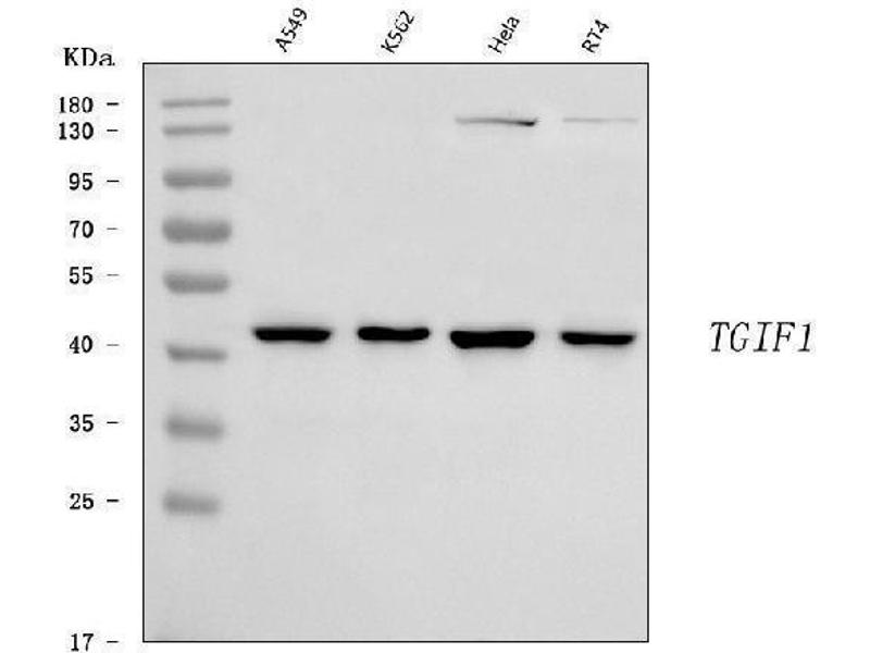 Background: Homeobox protein TGIF1 is a protein that, in humans, is encoded by the TGIF1 gene. The protein encoded by this gene is a member of the three-amino acid loop extension (TALE) superclass of atypical homeodomains. TALE homeobox proteins are highly conserved transcription regulators. This particular homeodomain binds to a previously characterized retinoid X receptor responsive element from the cellular retinol-binding protein II promoter. In addition to its role in inhibiting 9-cis-retinoic acid-dependent RXR alpha transcription activation of the retinoic acid responsive element, the protein is an active transcriptional co-repressor of SMAD2 and may participate in the transmission of nuclear signals during development and in the adult. Mutations in this gene are associated with holoprosencephaly type 4, which is a structural anomaly of the brain. Alternative splicing has been observed at this locus and multiple splice variants encoding distinct isoforms are described.