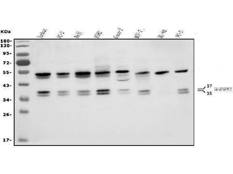 Background: Heterogeneous nuclear ribonucleoprotein H3 is a protein that in humans is encoded by the HNRNPH3 gene. This gene belongs to the subfamily of ubiquitously expressed heterogeneous nuclear ribonucleoproteins (hnRNPs). The hnRNPs are RNA binding proteins and they complex with heterogeneous nuclear RNA (hnRNA). These proteins are associated with pre-mRNAs in the nucleus and appear to influence pre-mRNA processing and other aspects of mRNA metabolism and transport. While all of the hnRNPs are present in the nucleus, some seem to shuttle between the nucleus and the cytoplasm. The hnRNP proteins have distinct nucleic acid binding properties. The protein encoded by this gene has two repeats of quasi-RRM domains that bind to RNAs. It is localized in nuclear bodies of the nucleus. This protein is involved in the splicing process and it also participates in early heat shock-induced splicing arrest by transiently leaving the hnRNP complexes. Several alternatively spliced transcript variants have been noted for this gene, however, not all are fully characterized.