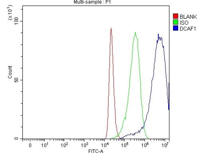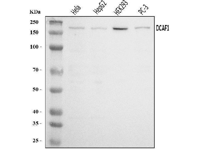 Background: VprBP was first identified as a protein that can interact with HIV-1 viral protein R. It is a component of the CUL4A-RBX1-DDB1-VprBP/DCAF1 E3 ubiquitin-protein ligase complex that could interact with HIV-1 virus Vpr protein and HIV-2 virus Vpx protein. VprBP is a 1,507-amino acid protein that contains conserved domains, including YXXY repeats, the Lis homology motif, and WD40 repeats. Through binding to Vpr, VprBP allows Vpr to modulate the catalytic activity of the CUL4-DDB1 complex, which in turn leads to the induction of G2 phase arrest in the virus-infected cells. Recently it has been reported that VprBP is able to regulate the p53-induced transcription and apoptotic pathway.