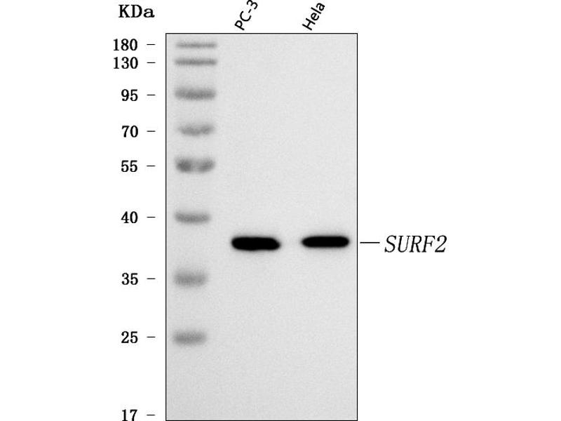- Anti-SURF2 Antibody (ABIN7602318). Tested in ELISA, Flow Cytometry, IF, ICC, WB applications. This antibody reacts with Human. This is a premium antibody that guarantees superior quality, high affinity, and strong signals with minimal background in Western blot applications.