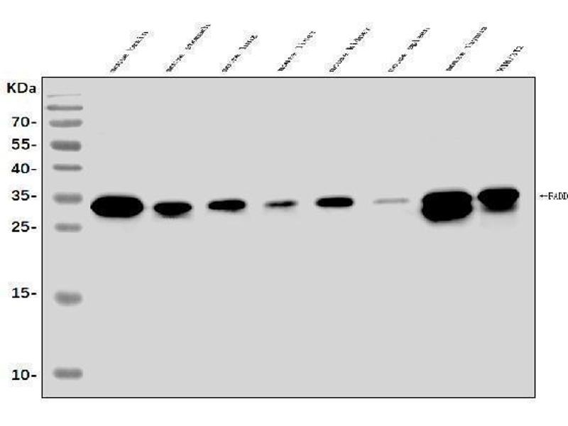 - A synthetic peptide corresponding to a sequence at the C-terminus of mouse FADD, which shares 63.6% and 81.8% amino acid (aa) sequence identity with human and rat FADD, respectively.