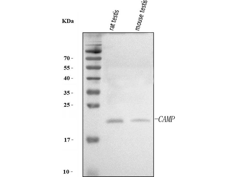 - A synthetic peptide corresponding to a sequence at the C-terminus of rat Camp, which shares 83.3% amino acid (aa) sequence identity with mouse Camp.