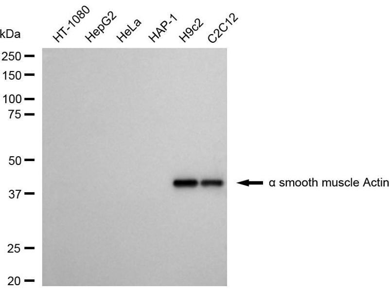 The Rabbit Monoclonal anti-Smooth Muscle Actin antibody has been validated for WB, FACS and IF (p). It is suitable to detect Smooth Muscle Actin in samples from Human.