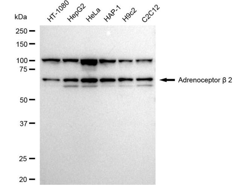 This Rabbit Monoclonal antibody specifically detects beta 2 Adrenergic Receptor in WB and FACS. It exhibits reactivity toward Human.