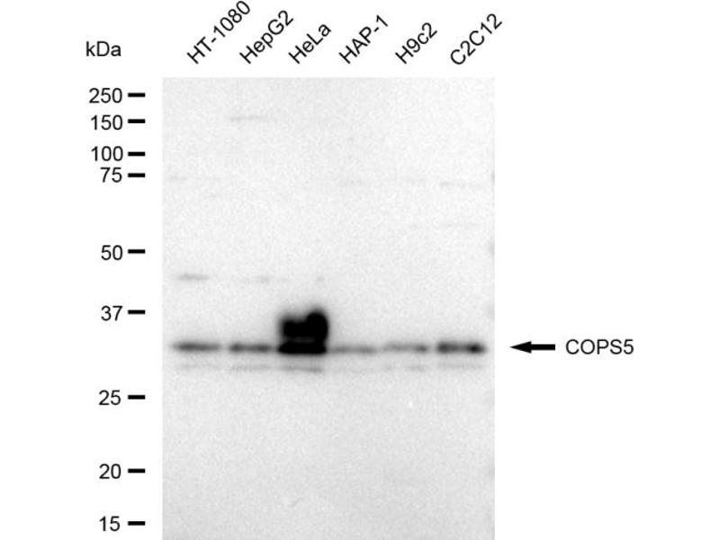 The Rabbit Monoclonal anti-COPS5 antibody is suitable to detect COPS5 in samples from Human. It has been validated for WB.
