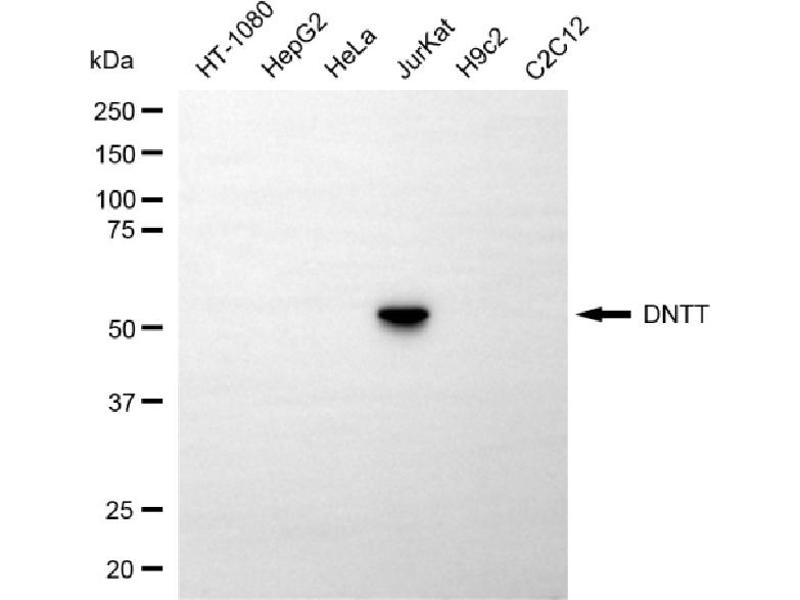 The Rabbit Monoclonal anti-TdT antibody (Clone 24GB14040) (ABIN7798309) specifically detects TdT in WB.