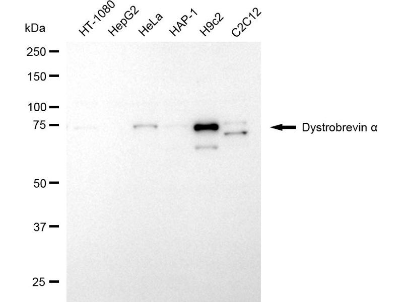 This Mouse Monoclonal antibody specifically detects DTNA in WB. It exhibits reactivity toward Human.