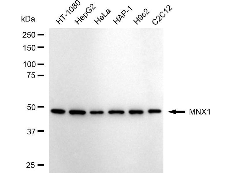 The Rabbit Monoclonal anti-MNX1 antibody is suitable to detect MNX1 in samples from Human. It has been validated for WB and FACS.