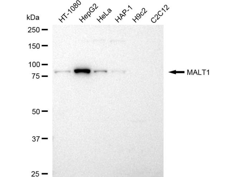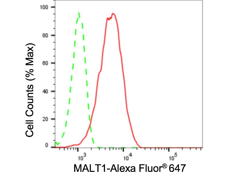 The Rabbit Monoclonal anti-MALT1 antibody (Clone 24GB440) (ABIN7799491) specifically detects MALT1 in WB, FACS and ICC.