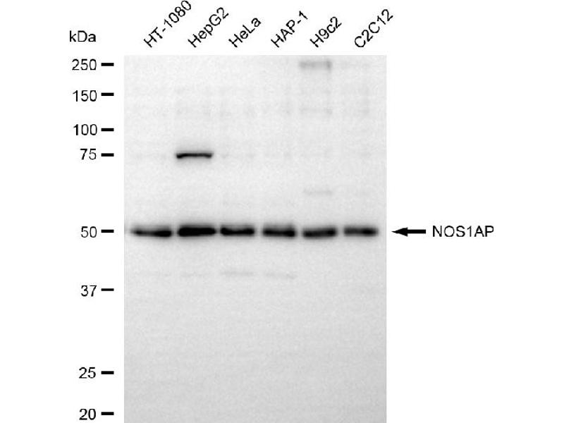 The Rabbit Monoclonal anti-NOS1AP antibody (Clone 25GB270) (ABIN7799605) specifically detects NOS1AP in WB and FACS.