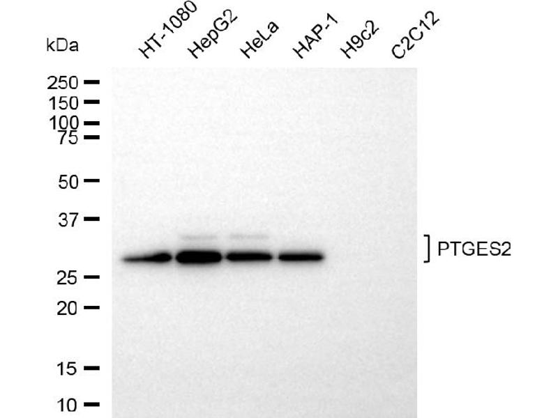 The Mouse Monoclonal anti-PTGES2 antibody is suitable to detect PTGES2 in samples from Human. It has been validated for WB and FACS.