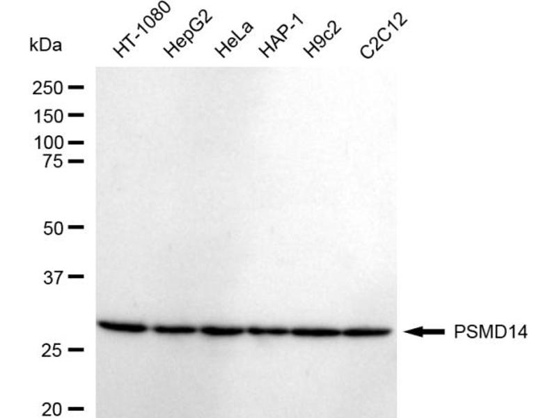 The Rabbit Monoclonal anti-PSMD14 antibody (Clone 24GB1660) (ABIN7799947) specifically detects PSMD14 in WB and FACS.
