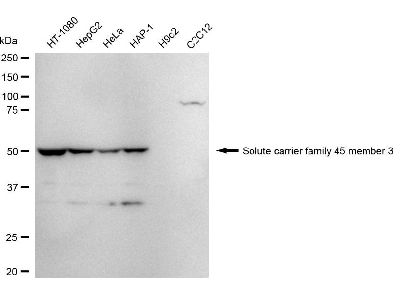 The Rabbit Monoclonal anti-SLC45A3 antibody (Clone 24GB1800) (ABIN7800397) specifically detects SLC45A3 in WB.