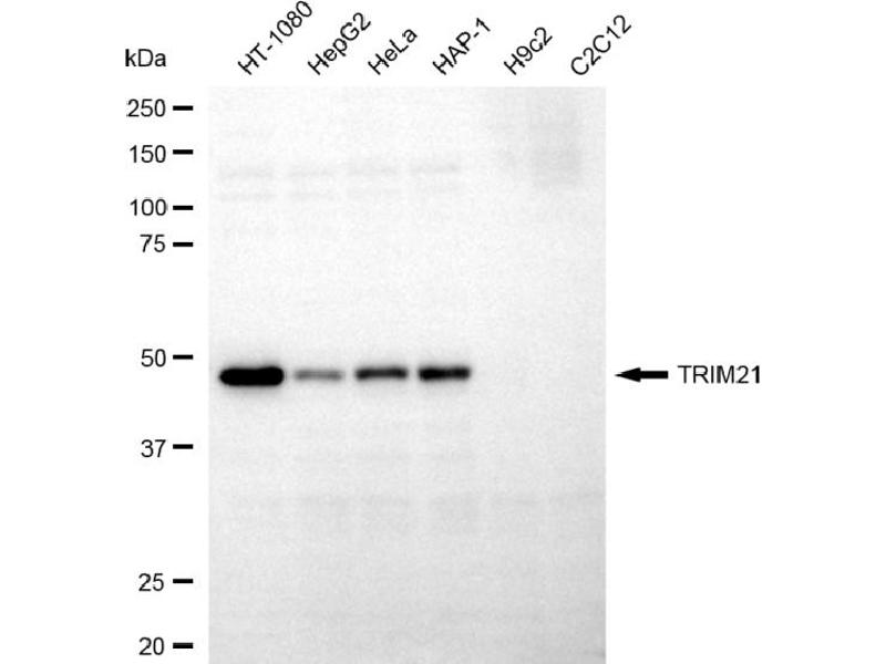 The Mouse Monoclonal anti-TRIM21 antibody is suitable to detect TRIM21 in samples from Human. It has been validated for WB.