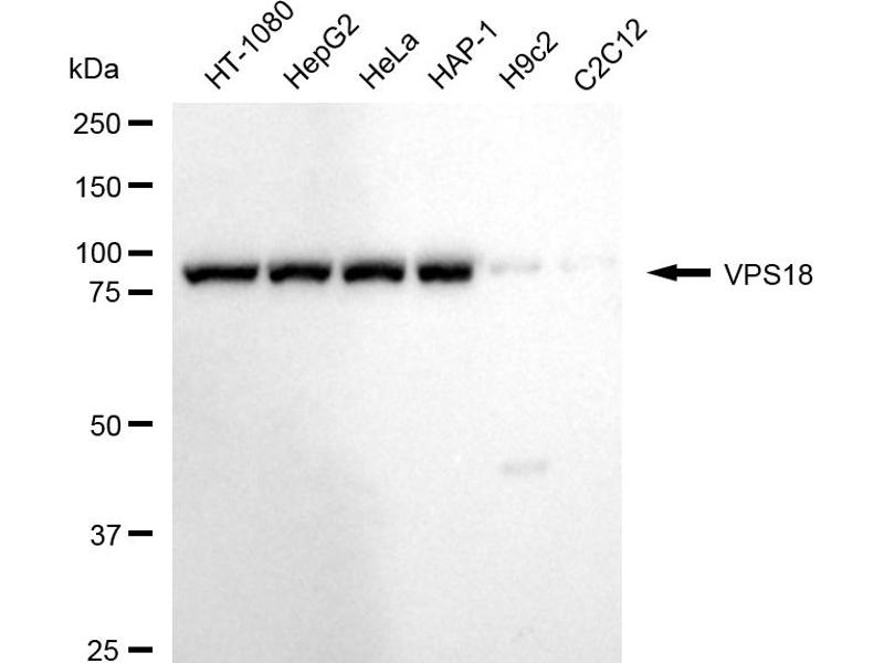 The Rabbit Monoclonal anti-VPS18 antibody has been validated for WB and FACS. It is suitable to detect VPS18 in samples from Human.