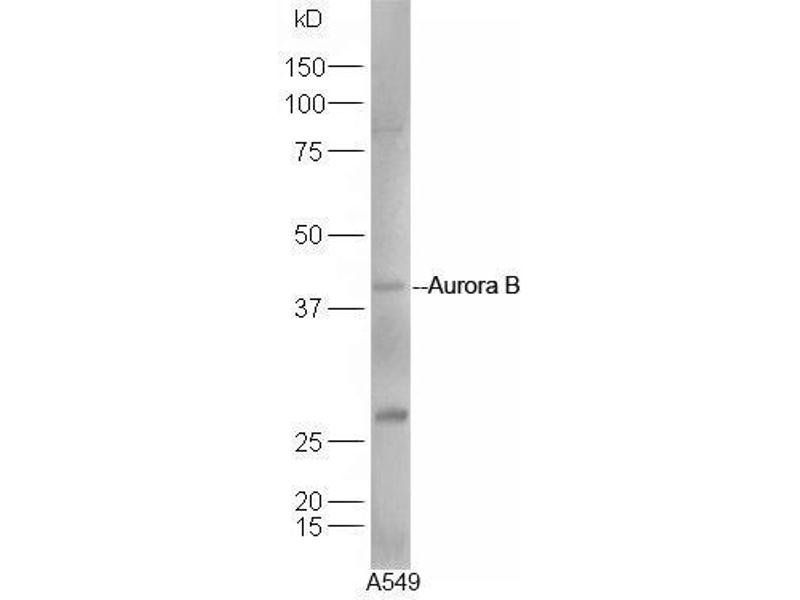 Background: Serine/threonine-protein kinase component of the chromosomal passenger complex (CPC), a complex that acts as a key regulator of mitosis. The CPC complex has essential functions at the centromere in ensuring correct chromosome alignment and segregation and is required for chromatin-induced microtubule stabilization and spindle assembly. Involved in the bipolar attachment of spindle microtubules to kinetochores and is a key regulator for the onset of cytokinesis during mitosis. Required for central/midzone spindle assembly and cleavage furrow formation. Key component of the cytokinesis checkpoint, a process required to delay abscission to prevent both premature resolution of intercellular chromosome bridges and accumulation of DNA damage: phosphorylates CHMP4C, leading to retain abscission-competent VPS4 (VPS4A and/or VPS4B) at the midbody ring until abscission checkpoint signaling is terminated at late cytokinesis (PubMed:22422861, PubMed:24814515). AURKB phosphorylates the CPC complex subunits BIRC5/survivin, CDCA8/borealin and INCENP. Phosphorylation of INCENP leads to increased AURKB activity. Other known AURKB substrates involved in centromeric functions and mitosis are CENPA, DES/desmin, GPAF, KIF2C, NSUN2, RACGAP1, SEPT1, VIM/vimentin, GSG2/Haspin, and histone H3. A positive feedback loop involving GSG2 and AURKB contributes to localization of CPC to centromeres. Phosphorylation of VIM controls vimentin filament segregation in cytokinetic process, whereas histone H3 is phosphorylated at 'Ser-10' and 'Ser-28' during mitosis (H3S10ph and H3S28ph, respectively). A positive feedback between GSG2 and AURKB contributes to CPC localization. AURKB is also required for kinetochore localization of BUB1 and SGOL1. Phosphorylation of p53/TP53 negatively regulates its transcriptional activity. Key regulator of active promoters in resting B- and T-lymphocytes.