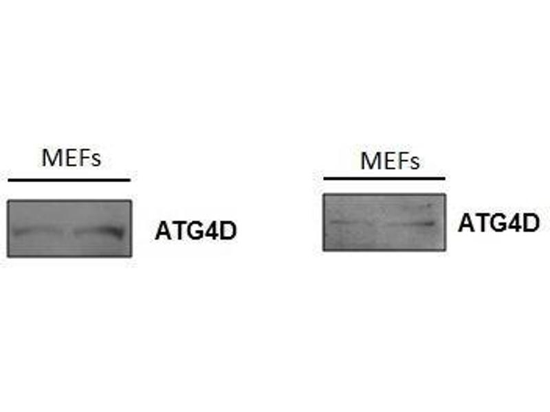 Background: Cysteine protease ATG4D: Cysteine protease required for the cytoplasm to vacuole transport (Cvt) and autophagy. Cleaves the C-terminal amino acid of ATG8 family proteins MAP1LC3 and GABARAPL2, to reveal a C-terminal glycine. Exposure of the glycine at the C-terminus is essential for ATG8 proteins conjugation to phosphatidylethanolamine (PE) and insertion to membranes, which is necessary for autophagy. Has also an activity of delipidating enzyme for the PE-conjugated forms. Cysteine protease ATG4D, mitochondrial: Plays a role as an autophagy regulator that links mitochondrial dysfunction with apoptosis. The mitochondrial import of ATG4D during cellular stress and differentiation may play important roles in the regulation of mitochondrial physiology, ROS, mitophagy and cell viability.