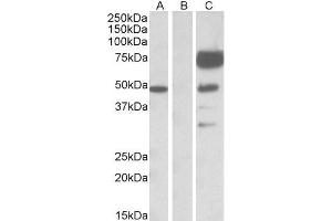 Western Blot: In transfected HEK293 transiently expressing full-length Human ANGPT1 (myc and DYKDDDDK tagged), a band of approx. 48 kDa was observed. No bands were observed in mock-transfected HEK293 and the 48 kDa plus a 75 kDa band was observed using anti