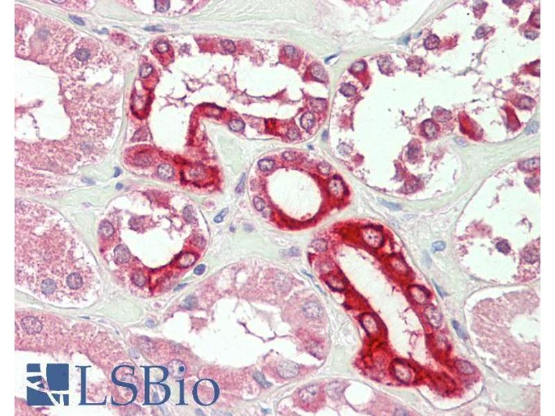 Immunohistochemistry: Paraffin embedded Human Kidney. Recommended concentration: 5 μg/mL.