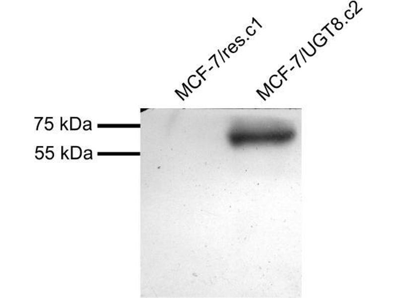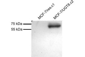 Western Blot: In transfected MCF7 transiently expressing Human UGT8 a band of approx. 65 kDa is observed. This band is not observed in the non-transfected MCF7. The calculated molecular size is 61.5 kDa according to NP_003351.2. Recommended concentration,
