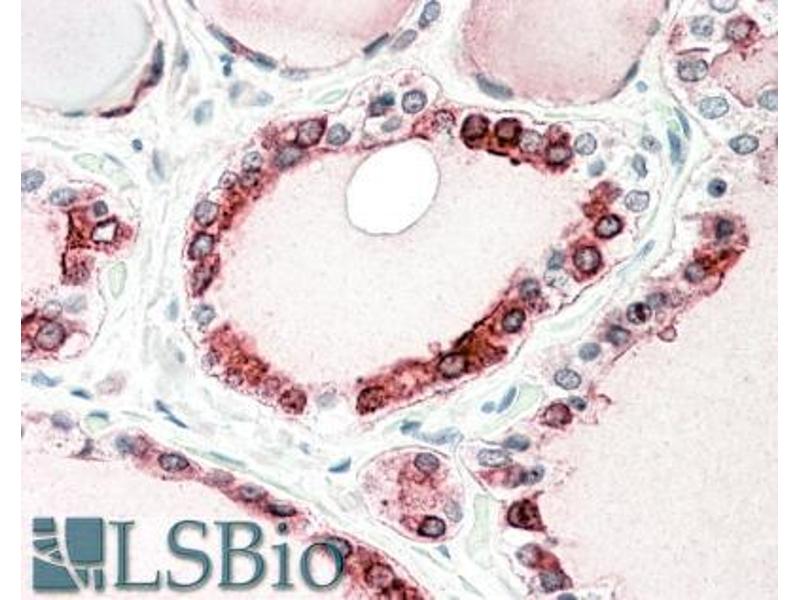 Immunohistochemistry: In paraffin embedded Human Thyroid Gland shows textured staining in the cytoplasm of epithelial cells. Recommended concentration, 5-10 μg/mL.