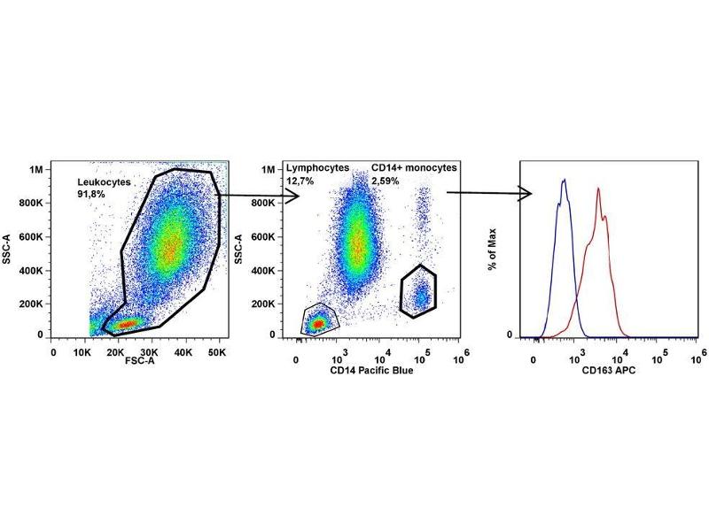 The mouse monoclonal antibody GHI/61 recognizes an extracellular epitope CD163, an approximately 130 kDa high affinity scavenger receptor expressed mainly on monocytes and macrophages, which binds hemoglobin-haptoglobin complex.