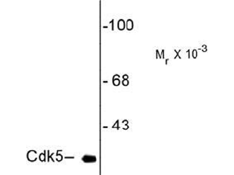 The neuronal protein kinase, Cdk5 has been implicated in a vast array of normal neuronal functions including regulation of neurotransmitter synthesis (Kansy J et al., 2004), the presynaptic vesicle cycle (Nguyen, C. & Bibb, JA 2003), neurotransmitter receptor trafficking and dopamine neurotransmission (Bibb, JA et al. 1999). At the same time Cdk5 has been implicated in a plethora of neurological and neuropsychiatric disorders including Alzheimer's, Parkinson's, Huntington's, epilepsy, schizophrenia, and drug addiction. Detection of Cdk5 in normal samples as well as tissue undergoing neurodegeneration may advance studies in these areas. Moreover, this antibody may allow more accurate postmortem evaluations of Cdk5 protein expression, and thus serve as a valuable new reagent for neuropathology.Synonyms: Cell division protein kinase 5, Cyclin-dependent kinase 5, PSSALRE, Serine/threonine-protein kinase PSSALRE, TPKII catalytic subunit, Tau protein kinase II catalytic subunit