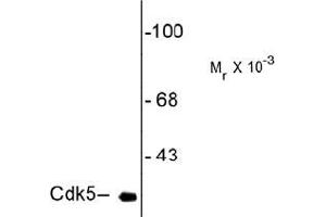 Specific for the ~ 28 kDa Cdk5 protein in Western blots of Rat striatal lysate. The antibody shows no cross reactivity with the CDK5 cofactor p35 or its degradation product p25.