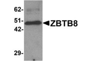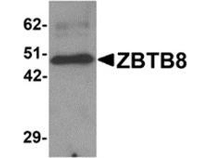 This antibody detects ZBTB8 at C-term. At least two isoforms of ZBTB8 are known to exist, this antibody will recognize both isoforms. This antibody is predicted to not cross-react with other ZBTB protein family members.