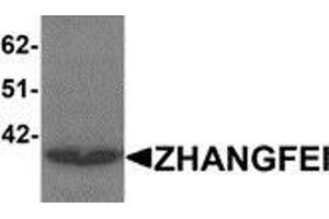 ZHANGFEI, also known as ZF, is a basic region-leucine zipper transcriptional factor that has been implicated in herpes virus infection cycle and related cellular processes. ZHANGFEI protein has a negatively charged active N-terminus, a leucine zipper of six heptad leucine repeats separated by a conserved six amino acid spacer, a basic domain and a bZIP region. ZHANGFEI strongly activates transcription and suppresses the expression of HSV proteins in cells infected with the virus in a HCFC1 dependent manner. It also suppresses the HCFC1 dependent transcriptional activation by CREB3 and reduces the amount of CREB3 in the cell.Synonyms: CREB/ATF bZIP transcription factor, HCF-binding transcription factor Zhangfei, Host cell factor-binding transcription factor Zhangfei, ZF