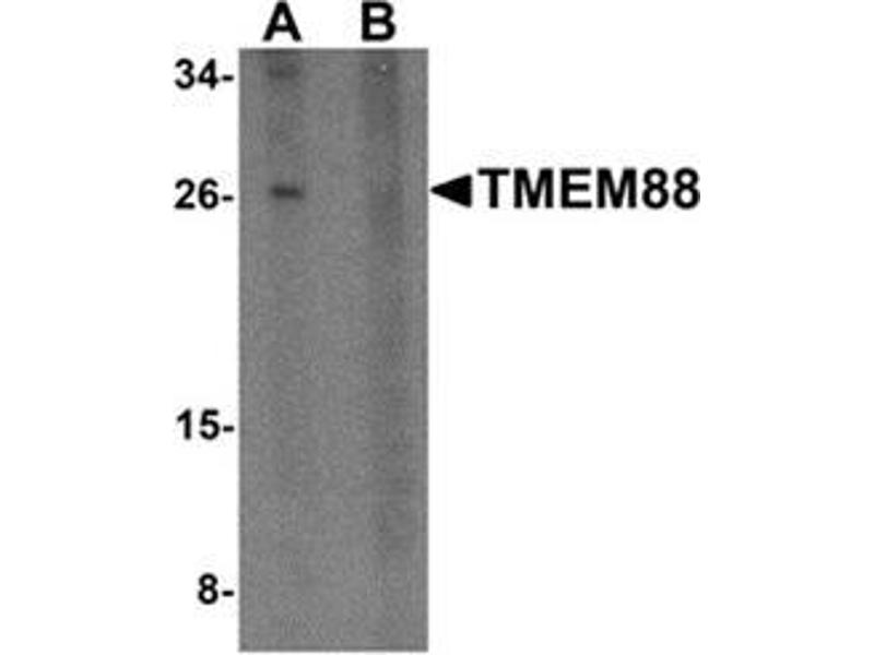 Transmembrane protein 88 (TMEM88) is a two-transmembrane-type protein whose C-terminal tail has been shown to bind the PDZ domain of Dishevelled (Dvl), one of the key components in Wnt signaling pathways. TMEM88 attentuated the Wnt/beta-catenin signaling induced by Wnt-1 ligand in a dose-dependent manner and knockdown of TMEM88 by RNAi increased Wnt activity, suggesting that TMEM88 plays a role in regulating Wnt signaling in a context-dependent manner.Synonyms: Transmembrane protein 88